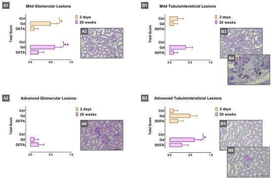 Total score of glomerular and tubulointerstitial lesions and representative images of some renal lesions observed in animals under study (PAS staining, 400×). The scale bar indicated in each image represents 100 µm. (A1) Total score for mild glomerular lesions observed in short-term (2 days) and in long-term (20 weeks) studies; (A2) total score for advanced glomerular lesions observed in short-term and in long-term studies; (A3) dilatation of Bowman’s space; (A4) glomerulosclerosis; (B1) total score for mild tubulointerstitial lesions observed in short-term and in long-term studies; (B2) total score for advanced tubulointerstitial lesions observed after 20 days or 20 weeks of exposure to compounds; (B3) interstitial inflammatory infiltrate; (B4) tubular dilation; (B5) vacuolar tubular degeneration; (B6) hyaline cylinders. Ctrl, control; Gd, gadolinium; DOTA, gadoteric acid. Results are presented as mean ± standard error of mean (SEM); * p < 0.05; ** p < 0.01.