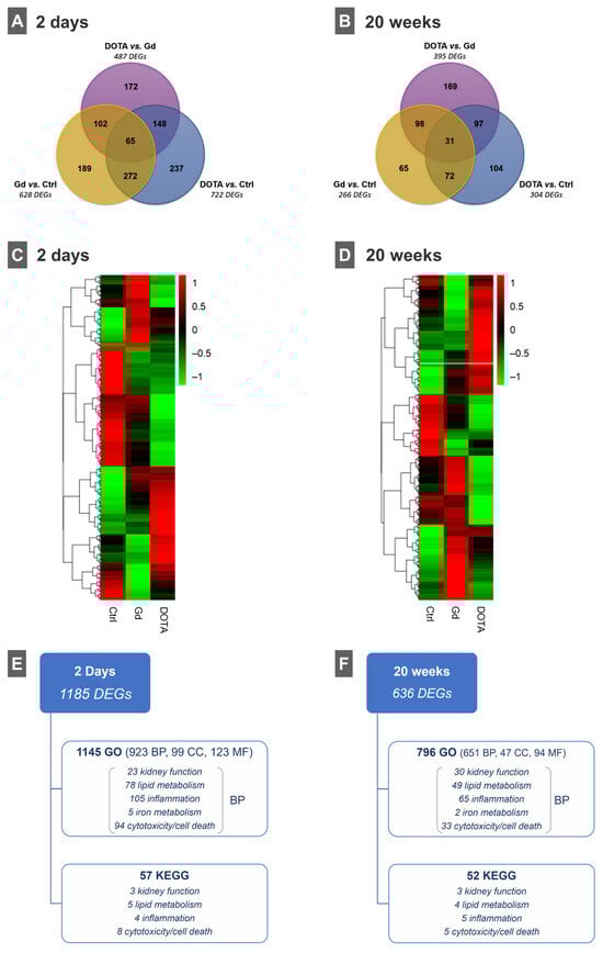 Venn diagrams of differentially expressed genes (DEGs) identified when comparing gene expression levels of Gd (III) vs. Ctrl, DOTA vs. Ctrl and DOTA vs. Gd (III) in (C) short-term and (D) long-term exposure studies. Heatmaps of gene expression levels of all identified DEGs in control (Ctrl), gadolinium (Gd (III)) and gadoteric acid (DOTA) groups (plots of hierarchical clustering of normalized FPKM values; red, high expression levels; green, low expression levels) for (A) short-term (2 days) and (B) long-term (20 weeks) studies. Functional/pathway enrichment analysis of all DEG results for (E) short-term and (F) long-term exposure studies (only terms with adjusted p-value < 0.05 are shown). BP, biological process; CC, cellular component; GO, gene ontology; KEGG, Kyoto Encyclopedia of Genes and Genomes; MF, molecular function.