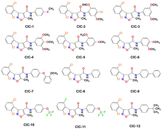 Illustration of the molecular structures of 12 Isoxazole-4-carboxamide derivatives, labeled CIC-1 through CIC-12.