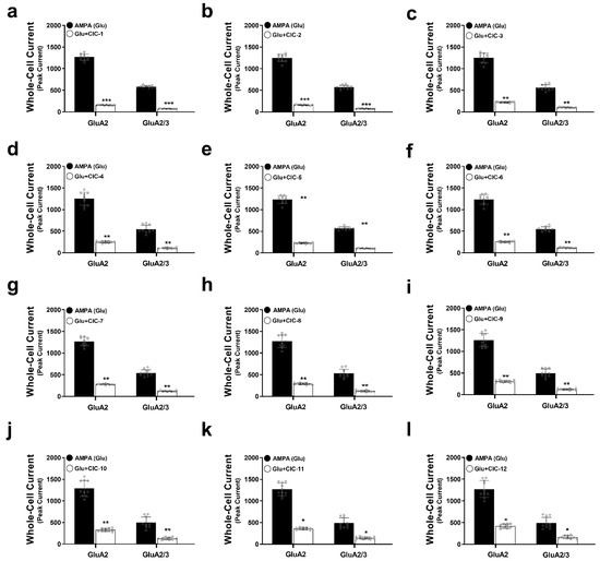 Effects of Isoxazole-4-carboxamide derivatives on AMPA receptor-mediated whole-cell currents. This figure demonstrates the inhibitory actions of Isoxazole-4-carboxamide derivatives on the whole-cell currents mediated by GluA2 and GluA2/3 AMPA receptor subtypes. Panels (a–l) represent data for the individual CIC compounds. Whole-cell patch clamp recordings were carried out on HEK293t cells expressing GluA2 or GluA2/3 subunits. AMPA-induced currents (black bars) are then compared to currents recorded in the presence of 16 µM CIC compounds (white bars). One-way ANOVA statistical tests were performed, * p < 0.05, ** p < 0.01, and *** p < 0.001, reflecting a significant reduction in currents. All the recordings were performed in whole-cell patch clamp mode at −60 mV, pH 7.4, and 22 °C. Data thus are shown as means ± SD.