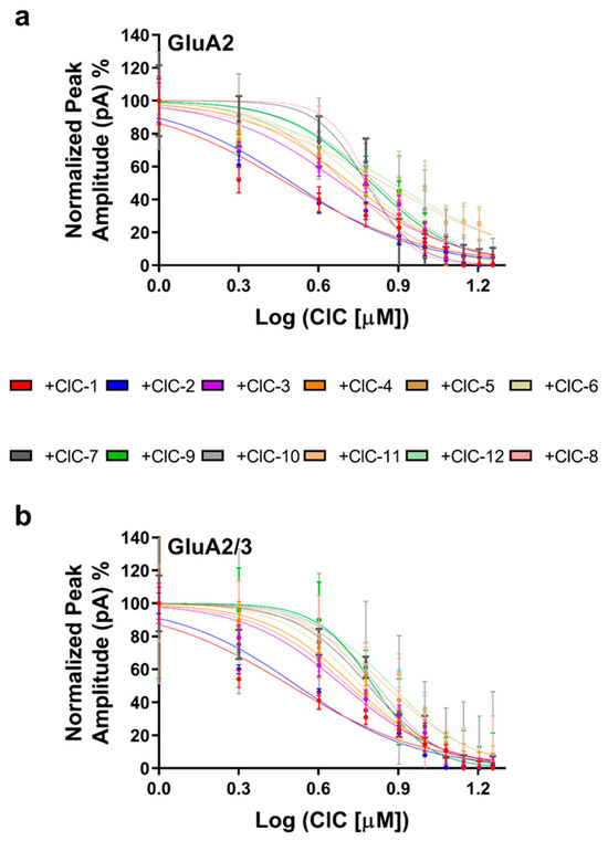 Dose-dependent inhibition of AMPAR subunits by CIC compounds. Whole-cell peak currents were recorded at −60 mV in HEK293t cells to evaluate the inhibitory effects caused by the various CIC compounds on the AMPA receptor subunits. The results regarding dose–response curves are shown as a percentage of the control current amplitude. For the assay, the concentration of CIC compounds was 16 μM. IC50 values were determined with non-linear regression in GraphPad Prism. Recordings were performed at pH 7.4 and 22 °C. The inhibitory effect on GluA2 receptors is shown in (a), and the dose–response relationship for the GluA2/3 receptors in (b) shows differences in inhibitory potency by the CIC compounds. Data points reflect results from more than one experiment, and error bars indicate ± SD for 10 cells.