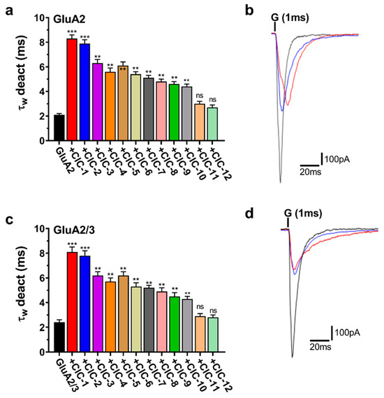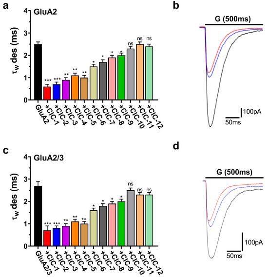 Deactivation kinetics (τw deact) of AMPAR subunits in the presence of CIC compounds. Panels (a,c) show τw deact weighted time constants for both GluA2 and GluA2/3 receptors activated by CIC compounds. Bar graphs show that CIC compounds extend the duration of deactivation kinetics. Statistical analysis was performed with the control condition (receptors exposed to glutamate alone) for each. Increases in τw deact that reached significance are marked with ** p < 0.01, *** p < 0.001, and “ns” for not significant (one-way ANOVA). Panels (b,d) show representative traces of whole-cell current responses to a 1 ms administration of 10 mM glutamate for GluA2 and GluA2/3, respectively. The traces show normalized responses for glutamate alone (black) and glutamate in combination with CIC compounds (CIC-1 in red, and CIC-2 in blue). The recording was performed in HEK293 cells at −60 mV, pH 7.4, and 22 °C. Data present mean ± SD from 3–4 different experiments.