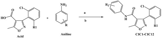 Synthesis of isoxazole–carboxamide derivatives (CIC1–CIC12). (a): EDC (1.3 equiv), (b): DMAP (0.3 equiv), DCM (15 mL), under inert gas, stirring for 48 h.