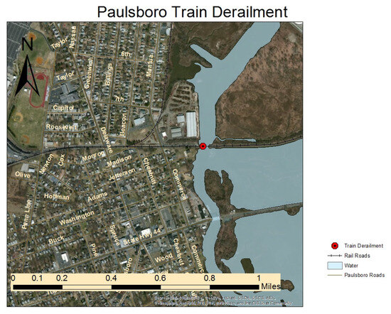 The site map of the train derailment for vinyl chloride derailment, which reported by the Division of Epidemiology, Environmental and Occupational Health New Jersey Department of Health in their 2014 Health Consultation. (https://www.state.nj.us/health/ceohs/documents/eohap/haz_sites/gloucester/train_derail/air_quality_report.pdf accessed on 3 December 2024) [29].