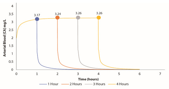 Our BM VC PBPK model was used to simulate four hours of exposure to determine the peak VC concentration in the blood for each hour following the initial incident. According to the exposure investigation, the AEGL-2 concentration for a 60 min exposure was approximately 1200 ppm, which was applied in one of the parameter settings. The model estimated the arterial blood concentration to be around 3.17 mg/L after an hour of exposure. As illustrated in Figure 2, there were slight increases in concentration over time as exposure continued.