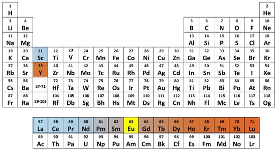 After their discovery, REEs have progressively gained significant scientific and industrial attention owing to their versatile applications across numerous sectors, including advanced technologies, green energy, agriculture, zootechny, and biomedicine []. They are indispensable in manufacturing high-strength permanent magnets, phosphors for displays, rechargeable batteries, catalytic converters, and various components for renewable energy technologies, such as wind turbines and electric vehicles. Furthermore, REEs are essential in defense applications, where their unique magnetic and conductive properties play a role in precision-guided weapons, radar systems, and aerospace technologies. Given their strategic importance, REEs are often termed “technology-critical elements” or “industrial vitamins”, because of their fundamental role in sustaining modern industrial processes []. In addition, REEs are being explored and used in the field of biomedicine, particularly as contrast and theranostic REE-based pharmaceutics [].