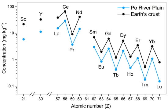 Comparison of average REE concentrations in the Earth’s crust (black line) and Po River Plain (blue line), Italy. Values are expressed in mg kg−1 on a logarithmic scale, as a function of the atomic number (Z). The values show consistently lower REE concentrations in the Po River Plain compared to the Earth’s crust, owing to sedimentary processes and geochemical fractionation occurring in fluvial environments. Nevertheless, the characteristic “zig-zag” pattern of REE abundances, explained by the Oddo–Harkins rule [], is preserved, reflecting the greater stability and abundance of elements with an even Z compared to those with an odd Z. The Earth crust values are from []; the Po River Plain data are provided by Renzo Tassinari, University of Ferrara. The graph was created with OriginPro 2025 (OriginLab Corporation, Northampton, MA, USA).
