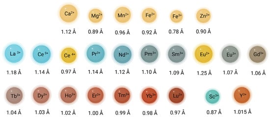 It is common to classify the REEs into two groups, based on their atomic numbers (Figure 1). The light REEs (LREEs) include the first seven lanthanides, La, Ce, praseodymium (Pr), neodymium (Nd), Pm, and samarium (Sm), along with Sc. The last eight lanthanides are referred to as heavy REEs (HREEs): gadolinium (Gd), terbium (Tb), dysprosium (Dy), holmium (Ho), erbium (Er), thulium (Tm), ytterbium (Yb), and Lu. Though lighter than the lanthanides, Y has a reactivity similar to HREEs []. Eu lies between the LREEs and the HREEs. The ionic radius decreases from La3+ to Lu3+, representing the “lanthanide contraction”, which follows the increasingly positive charge of the nuclear atom. The REEs ionic radii are reported in Figure 3, in comparison with those of elements used by plants as micronutrients. The similarity of their ionic radius with that of Ca2+ is particularly evident for the LREEs. Other essential cationic micronutrients are considerably smaller.