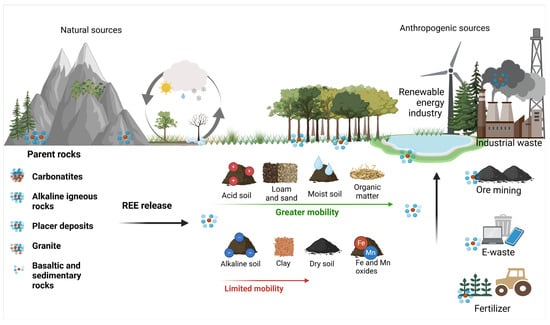 REEs originate from natural and anthropogenic sources, undergoing various processes that influence their release, mobility, and environmental impact. Natural sources include a variety of parent rocks, from which weathering processes driven by precipitation, temperature variations, and erosion facilitate the release of REEs into the environment. Once released, their mobility in soils depends on several physicochemical conditions, which also influence their bioavailability. Anthropogenic activities significantly contribute to REE dispersion, primarily through ore mining, industrial waste discharge, electronic waste (E-waste) disposal, and fertilizer application. These activities lead to the accumulation of REEs in terrestrial and aquatic ecosystems, potentially disrupting natural biogeochemical cycles and posing environmental risks. The image was built using BioRender (BioRender Inc., Toronto, ON, Canada).