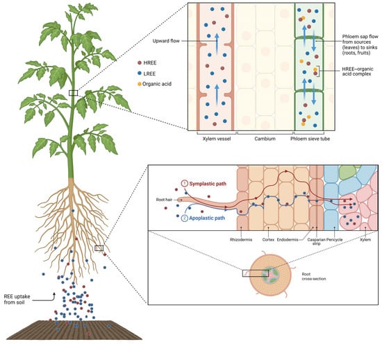 Uptake and transportation pathways involving REEs in plants, starting from the soil. The lower panel details the absorption pathways and the role of the Casparian strip in regulating the entry of REEs into the vascular system. REEs are initially absorbed mainly through the apoplastic pathway, diffusing through cell walls and extracellular spaces. At the level of the Casparian strip, a selective process occurs, allowing a higher proportion of LREEs to cross compared to HREEs. Beyond the Casparian strip, REEs continue through the symplastic pathway, moving through the cytoplasm via plasmodesmata, reaching the xylem vessels for upward flow toward the aerial parts of the plant (upper panel). In the phloem sieve tubes, REEs are redistributed from sources (e.g., leaves) to sinks (e.g., roots and fruits) as REE–organic acid complexes, facilitating their mobility. The binding to organic acids promotes relative HREE enrichment in the phloem sap. The image was built using BioRender (BioRender Inc., Toronto, ON, Canada).