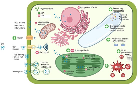 REEs bind extensively to the cell wall matrix, mainly pectins, and facilitate endocytosis, either clathrin-mediated or not. REEs also interact with the plasma membrane, facilitating cation uptake and influencing Ca2⁺ signalling. Inside the protoplast, REEs exhibit both positive and negative effects on various functions, based on their concentration (hormetic effect). The mitochondrial functionality can be impaired, while chloroplasts experience mixed effects on photosynthesis, including possible Mg2⁺ substitution in chlorophyll, reduced RuBisCO activity, and diverse impacts on chlorophyll metabolism and PSII stability. Note that the abundant negative charges at the thylakoid surface in the grana partitions offer many chances for ionic REE interactions. In the cytosol, REEs influence the production of phytohormones and reactive oxygen species (ROS). ROS lead to lipid peroxidation and stimulate the production of secondary metabolites, osmoprotectants, and antioxidant enzymes, playing a protective role against oxidative stress. At the nuclear level, REEs can induce negative cytogenetic effects. The image was built using BioRender (BioRender Inc., Toronto, ON, Canada).
