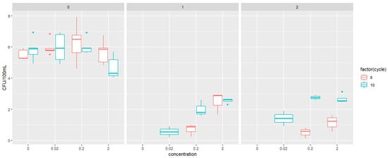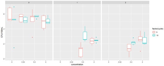 Exposure to triclosan and propylparaben at 0.2 and 2 mg/L induced inhibitory effects on bacterial growth, reflected by the total cell concentration that was reduced from 1.22 × 107 CFU/100 mL (0 mg/L dose) to 4.54 × 106 CFU/100 mL (0.2 mg/L dose) and 6.36 × 105 cells/100 mL (2 mg/L dose treatment), respectively. There was no bacterial growth on the 1MIC and 2MIC plates with the treatment of 0 mg/L (control treatment) for the bacterial culture exposed to TCS (Figure 1) and PPB (Figure 2). We observed a significant difference (p < 0.05) in the abundance between the 5th cycle and the 10th cycle on the plates for TCS (p = 0.0159) and PPB (p = 0.0337).