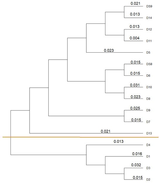 - Tamura, K.; Stecher, G.; Kumar, S. MEGA11: Molecular Evolutionary Genetics Analysis Version 11. Mol. Biol. Evol. 2021, 38, 3022–3027. [Google Scholar] [CrossRef]
