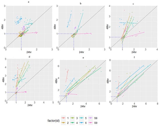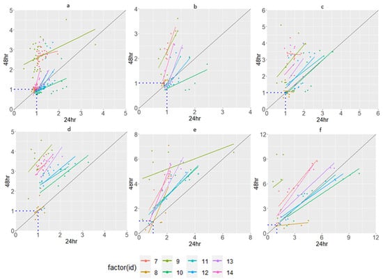 Catabolic activity of isolates exposed to propylparaben, showing: (a) sugars; (b) carbon utilization; (c) hexose acids; (d) amino acids; (e) carboxylic acids, testers, and fatty acids; (f) GN-GP. The figures show the OD value of a specific well divided by the OD value of the negative control. The dotted line at value 1 indicates the similarity between the negative control and the substrate. The diagonal line shows the relationship between the substrate utilization after 24 and 48 h. Dots below the diagonal line are substrates utilized less after the first 24 h.