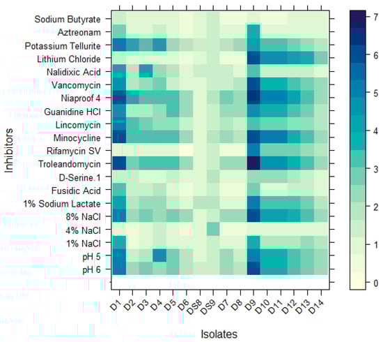 When looking at the resistance to inhibitory chemicals, isolate 12 and isolate 13 react similarly to the same inhibitors, though all the other isolates have a different pattern. The wells with tetrazolium violet and tetrazolium blue had the most activity; both substances are from the class “reducing power”. Tetrazolium is mainly used to indicate extracellular redox activity and cell redox potential [63]. Fast-growing bacteria adapted to high substrate concentrations mostly contribute to tetrazolium dye reduction on bacterial plates [64]. Isolate S8 has resistance to most of the inhibitors.
