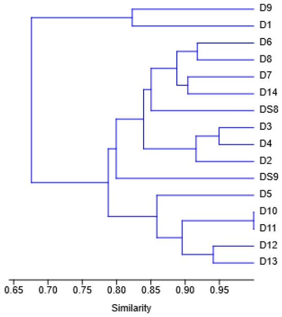Based on the 16S rRNA sequences and the carbon utilization (Biolog® plates, Hayward, CA, USA, a similarity analysis of the 16 strains was determined [52]. The maximum likelihood method and the Tamura–Nei model were applied for the 16S rRNA gene sequence analysis. For the cluster analysis based on data using Biolog® GENIII plates, we used the metabolic response measured after 24 h. The data were corrected against the negative control, and the clustering analysis (Bray–Curtis similarity) was performed using PAST version 4.17 [53].
