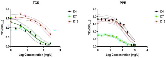 We selected strains D4, D7, and D13 to determine the 50% inhibition concentrations (IC50) and MIC of both compounds from 24 h growth curves (Supplementary Figures: Figures S1–S6). The TCS MIC was 64, 128, and >256 mg/mL for strains D4, D7, and D13, respectively. Likewise, the PPB MIC was 512, 512, and 800 for strains D4, D7, and D13, respectively. Fitting the IC50 values using the OD 24 h as the response value did not always agree with the actual MIC because of outlier OD values at lower concentrations. The high MIC values of strain D13 coincide with the earlier observation of the investigation of antiseptic efficacy under standardized and harmonized conditions, where the MIC for triclosan for Pseudomonas aeruginosa (ATCC 15442) was above 512 mg/L [65]. Interestingly, despite the high resistance to TCS by the tested strain, multi-drug resistance was limited (Table 4) because TCS induces resistance to other membrane-active agents but not to clinically relevant antibiotics that target other cell components [66].