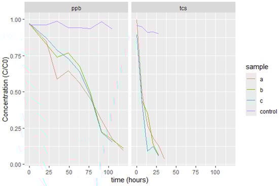 So far, our research has focused on the exposure of TCS and PPB to bacteria and their distinct reactions in terms of developing antibiotic resistance. As shown in Figure 9, a rapid biodegradation of TCS was observed, and 28 h were required to achieve the complete disappearance of TCS. In the control, the removal is negligible. The triclosan concentration was reduced to 50% after 7 h, and the degradation rate decreased in the last 15 h of the experiment. In contrast, the biodegradation of PPB lasted more than 100 h until complete removal. The propylparaben concentration was reduced to 50% after 75 h, and surprisingly, the degradation rate increased in the last 25 h of the experiment. For both compounds, biodegradation can be an additional mechanism of resistance that can also result in resistance to other antibiotics.