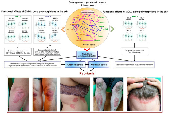 The present study demonstrates, for the first time, that polymorphisms in the gene encoding glutathione S-transferase omega 1 serve as novel genetic markers for susceptibility to psoriasis. Notably, various polymorphisms in the GSTO1 gene exhibited synergistic effects on the risk of psoriasis and contributed to disease susceptibility in a sex-dependent manner. Additionally, we identified joint effects on disease risk for polymorphisms in the GSTO1 gene and the catalytic subunit of the glutamate cysteine ligase gene, which encodes the first enzyme in the cellular glutathione biosynthetic pathway. Furthermore, we observed that environmental risk factors, such as alcohol abuse and cigarette smoking, also exhibited joint effects with GSTO1 and GCLC polymorphisms on the risk of developing psoriasis. The results of the study provide new evidence confirming that psoriasis is a typical multifactorial disease, resulting from a complex interaction of genetic and environmental factors. In addition, this study emphasizes the crucial role of impaired glutathione detoxification mechanisms in the molecular pathogenesis of psoriasis. Potential mechanisms by which GSTO1 gene polymorphisms may contribute to the development of psoriasis are summarized in Figure 1. The phenotypic effects associated with GSTO1 gene polymorphisms are likely mediated by alterations—specifically reductions—in the expression levels of the GSTO1 and GSTO2 genes, as well as other adjacent genes that may be regulated by shared enhancers located within the genomic region 10q25.1. Polymorphisms in GSTO1 and GSTO2 are known to be sites for alternative splicing of these genes in the skin. This may lead to the production of functionally distinct enzyme isoforms with varying activities concerning the conjugation of cutaneous xenobiotics and free radicals with glutathione. Increased consumption of glutathione by glutathione S-transferases and glutathione peroxidases, which neutralize free radicals and xenobiotics, along with the harmful effects of alcohol, smoking, and other external factors, contributes to the depletion of glutathione, in addition to its reduced synthesis by glutamate cysteine ligase. Consequently, these disorders lead to the accumulation of free radicals and toxic substances, thereby initiating oxidative stress and causing damage to skin tissue. It is unequivocal that oxidative stress acts as a mechanistic pathway in the pathogenesis of psoriasis and represents a fundamental mechanism underlying the detrimental effects of environmental chemicals [9]. Gaining deeper insights into how the polymorphisms of the GSTO1 gene interact with other genes associated with glutathione metabolism could pave the way for innovative, evidence-based strategies for treating and preventing psoriasis.