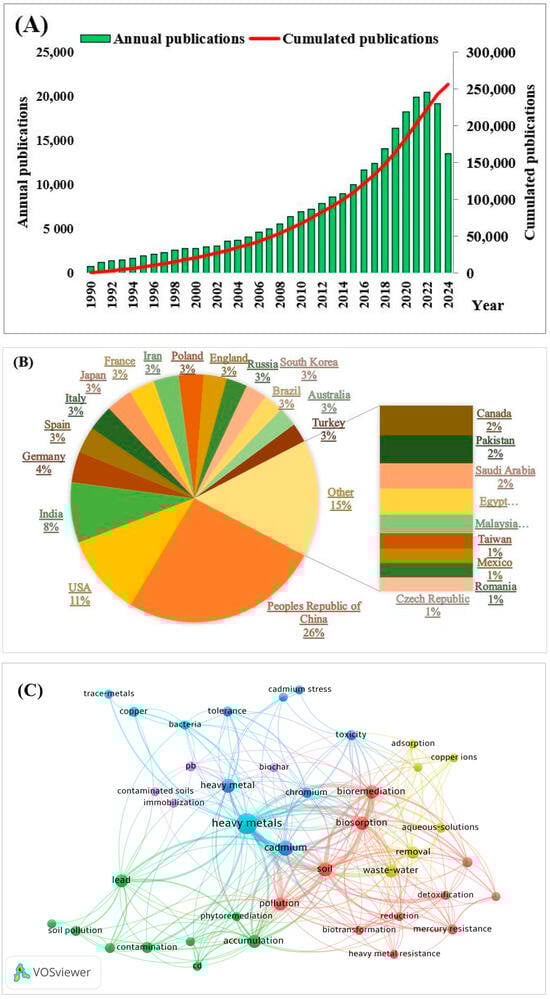 (A) Number of publications per year along with cumulated annual publications in the Web of Science database citing the term “heavy metal” between 1990 and 2024. (B) First 25 countries, based on total number of publications in the Web of Science database, citing the term “heavy metals” between 1990 and 2024. (C) Network visualization on co-occurrence of keywords related to heavy metals, generated using the VOSviewer software (version 1.6.20, The Netherlands).