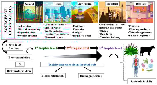 Anthropogenic sources of domestic, industrial, commercial, and agrochemical wastes represent the primary pathway of heavy metal release in the natural reservoirs [24]. Within the trophic levels, these hazardous compounds may be bioaccumulated, bioconcentrated, and biomagnified, altering ecosystemic quality and threatening the safety of all living organisms, including the human population (Figure 2) [25].