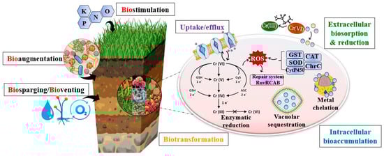 Biotransformation is a resistance mechanism involving the chemical alteration of hazardous compounds through oxido-reduction, methylation, and demethylation, leading to the synthesis of less toxic forms by the enzymatic activity of reductases and methyltransferases. For instance, the enzymatic reduction of Hg2+ to HgO has been obtained by using bacterial mercury reductases, whereas methyl-, phenyl-, and ethyl-mercury have been proven to be metabolized by organomercurial lyases, forming Hg2+ along with either methane, benzene, or ethane [82]. In regards to chromium biotransformation, chromate reductases are the main agents involved in the reduction of Cr(VI) to the less toxic Cr(III), their activity being observed in both bacteria and fungi [83]. However, biotransformation may sometimes lead to the formation of chemical forms with amplified toxicity compared with the parent material. The reduction of Cr(VI) results in the short-term formation of reactive intermediates such as Cr(V) and Cr(IV) that can oftentimes generate the production of ROS and even induce DNA breakage [84]. The process of biotransformation and microbial metabolism in general can be enhanced through the addition of glucose and other organic amendments which facilitate the reduction, stabilization, and decrease in bioavailability of metals [85].
