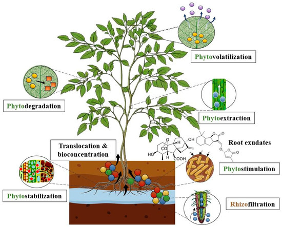 Phytoremediation may be employed in both aquatic and terrestrial environments through rhizofiltration, phytoextraction, phytovolatilization, phytostabilization and phytotransformation. These processes can also be supported through by the symbiotic relation between plants and the soil microbiome through phytostimulation [115] (Figure 5). Certain functional traits seem to be more favorable in phytoremediation, as studies demonstrate that dense root systems with a higher number of young, fine roots, higher leaf biomass, higher growth rate, and greater overall biomass production are correlated with a higher bioremoval efficiency against heavy metals [116]. Environmental parameters such as pH, temperature, organic matter content, soil texture, and nutrient availability also directly influence phytoremediation by dictating the speciation, bioavailability, and mobility of metal ions, as well as microbial diversity and functions, crop yield, and plant metabolism [117].