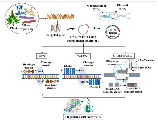Gene editing technologies (zinc finger nucleases (ZFNs), transcription activator-like effector nucleases (TALENs), and (CRISPR)/CRISPR-associated endonuclease system (Cas)) used for improving targeted traits in plants or microorganisms (figure created in the Mind the Graph platform).