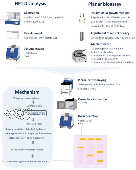 In this study, the Ames MPF assay with two S. Typhimurium strains, TA100 and TA98, was transferred to the planar assay format. Therefore, different parameters were tested on an HPTLC silica gel 60 plate, and various mutagenic positive controls [] were investigated. The planar Ames assay would enable a direct separation of mutagens from interfering compounds, allowing for a more selective and faster detection of individual mutagenic compounds in complex sample matrices compared to the limited conventional Ames assays, including the microtiter plate format.