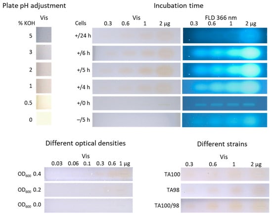 Results of the factors of influence: pH adjustment of the HPTLC silica gel 60 plate treated without (0%) and with five different KOH concentrations (0.5–5%); different incubation times (0–24 h) of the positive control 4NQO (0.3–2 µg/band) with S. Typhimurium TA100 (+) versus without (–); different OD600 (0.0–0.4) of strain TA100 culture incubated with 4NQO (0.06–1 µg/band) for 5 h; and individual TA100 and TA98 strains versus combined strains TA98/TA100 (1:1) incubated with 4NQO (0.3–2.0 µg/band) for 5 h, all detected after the planar Ames bioassay at Vis and FLD 366 nm.