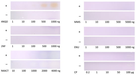 Comparison of five different mutagenic positive controls detected at Vis after the planar Ames bioassay with (+) versus without (−) the combined S. Typhimurium strains TA98/TA100: ENU (1–1000 ng/band), MMS (1–5000 ng/band), CP (0.2–100 µg/band), N4ACT (10–4000 ng/band), 2NF (1–1000 ng/band), and 4NQO (1–1000 ng/band) detectable at 100 ng/zone. The planar bioassay sensitivity was worse due to the short 5 h incubation time compared to the Ames MPF assay (48 h).