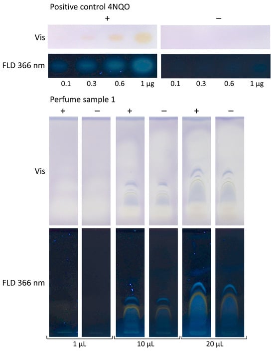 The planar Ames assay enabled direct detection of individual mutagenic compounds in complex samples and a separation from matrix interferences. This is key in contrast to the Ames MPF assay, which provides only a sum value and is prone to false negatives and false positives. Different sample volumes of a perfume sample (1, 10, and 20 µL/band) were analyzed. On the same chromatogram, 4NQO (0.1–1 µg/band) was applied as a positive control above the solvent front. After performing the bioassay, the increasing volumes of the positive control 4NQO showed increasingly yellow-colored and blue fluorescent zones, which proved proper assay performance (Figure 4). In the HPTLC–Ames bioassay–FLD bioautogram (+), mutagenicity was indicated because comparatively stronger blue fluorescent sample zones were detected in contrast to the negative control chromatogram (−). Mutagenicity was evident for all three sample volumes. The absorbance detection was not as sensitive as the fluorescence detection, and it was masked by interference with blue-colored matrix zones, which made the detection of any difference in the yellow zone coloration between the HPTLC–Ames bioassay–Vis bioautogram (+) and the negative control chromatogram (−) obsolete.