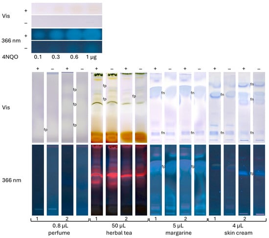 Analysis of two samples each of the four different categories (volumes as indicated) on an HPTLC silica gel 60 plate developed with cyclohexane–ethyl acetate 19:1 (perfumes), dichloromethane–methanol–ammonia 85:15:1 (herbal teas), and pentane–diethyl ether 8:3 (margarines and skin creams). Proper bioassay performance was proven by the positive control 4NQO (0.1–1 µg/band), detected as an increase in yellow zones with increasing volumes; however, for the eight samples, no difference was observed between the HPTLC–Ames bioassay–Vis bioautograms (+) and the negative control chromatogram (−). These planar bioutograms clearly demonstrate the problems of the Ames MPF assay sum value result for the analysis of such complex mixtures with no differentiation of false positives (fp; white/yellow-colored or blue-fluorescent zones) and false negatives (fn; blue-colored).