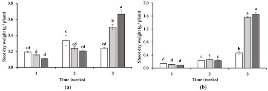 Growth assessed through root (a) and shoot (b) dry weight of wheat grown for 1, 2, and 3 weeks in soil in which non-mycotrophic Silene gallica (white columns), mycotrophic Lolium rigidum (light gray columns), or Ornithopus compressus (dark gray columns) had previously been grown. Different letters indicate statistically significant differences (p < 0.05) on the basis of Tukey’s test.