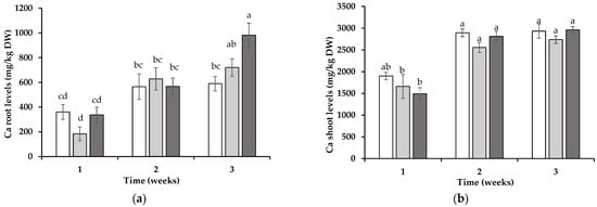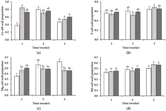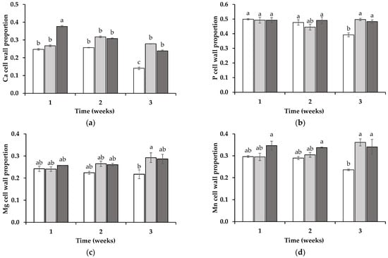 The ratio of calcium (Ca) (a), phosphorus (P) (b), magnesium (Mg) (c), and manganese (Mn) (d) in the roots of wheat grown in soil in which non-mycotrophic Silene gallica (white columns), mycotrophic Lolium rigidum (light gray columns), or Ornithopus compressus (dark gray columns) had previously been grown as assessed for 1, 2, and 3 weeks. Different letters indicate statistically significant differences (p < 0.05) on the basis of Tukey’s test.