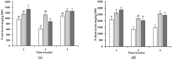 Calcium (Ca) (a,b) and phosphorous (P) (c,d) levels in roots (a,c) and shoots (b,d) of wheat planted in soil into which non-mycotrophic Silene gallica (white columns), mycotrophic Lolium rigidum (light gray columns), or Ornithopus compressus (dark gray columns) had previously been grown, as monitored for 1, 2, and 3 weeks. Different letters indicate statistically significant differences (p < 0.05) on the basis of Tukey’s test.
