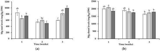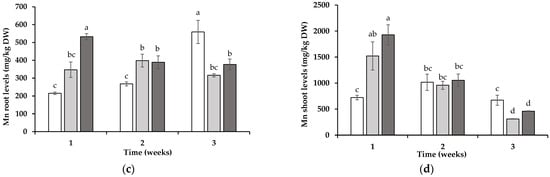 Magnesium (Mg) (a,b) and manganese (Mn) (c,d) levels in roots (a,c) and shoots (b,d) of wheat planted in soil in which non-mycotrophic Silene gallica (white columns), mycotrophic Lolium rigidum (light gray columns), or Ornithopus compressus (dark gray columns) had previously been grown as monitored for 1, 2, and 3 weeks. Different letters indicate statistically significant differences (p < 0.05) on the basis of Tukey’s test.