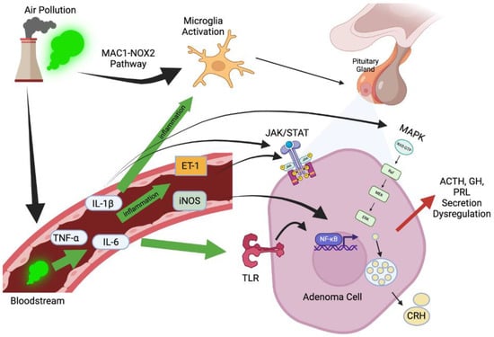 Air pollution enters the bloodstream and triggers inflammation, upregulating inflammatory cytokines, including TNF-α, IL-6, and IL-1β. The cytokines activate microglia and particles directly stimulate microglia, which in turn directly propagates CNS and HPA axis inflammation. The cytokines also upregulate iNOS and ET-1, as well as stimulating numerous inflammatory pathways, including JAK/STAT, MAPK, TLR, and NF-κB, which cause hormonal dysregulation affecting trophic hormones and directly affecting anterior pituitary hormone production.