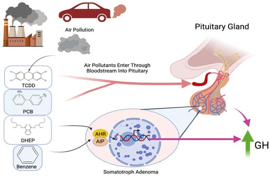 Schematic illustration depicting the proposed mechanistic link between air pollution exposure and growth hormone dysregulation in pituitary tumorigenesis, mediated through endocrine disruption at the level of the pituitary gland. Environmental pollutants, including TCDD, PCB, DHEP, and benzene, activate AHR and AIP in somatotroph cells, leading to increased GH secretion, which may contribute to tumor progression pathophysiology.