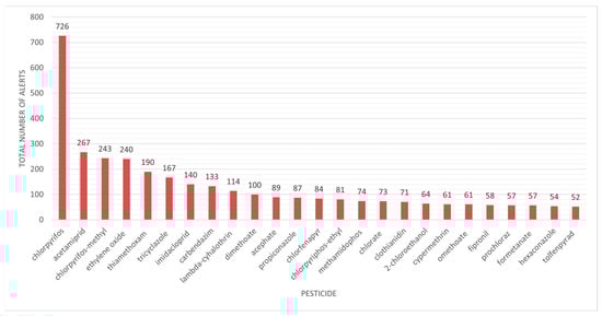 We aimed to determine which pesticide type was more frequently associated with the generated alerts. Chlorpyrifos generated 726 notifications, followed by acetamiprid with 267 notifications and chlorpyrifos-methyl with 243 notifications, far surpassing other chemicals (Figure 3). The major problem is that the use of this pesticide is unauthorized. Chlorpyrifos (O,O-diethyl-O-3,5,6-trichloro-2-pyridyl phosphorothioate), an organophosphate pesticide, is essential for pest management across many crops, fruits, and vegetables. It is a recognized acetylcholinesterase (AChE) inhibitor that leads to the accumulation of acetylcholine, resulting in overstimulation of postsynaptic receptors and resulting negative consequences [27]. Chlorpyrifos and other organophosphate exposures in the USA caused projected yearly losses of up to billions of dollars due to cognitive declines and abnormalities in brain development. As a result, the European Union prohibited the usage of chlorpyrifos in 2020, followed by the US in 2021 [28].