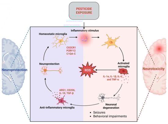 Compelling data indicate that inflammatory responses contribute to organophosphate-mediated neuronal damage, resulting in unfavorable neurological prognoses. A substantial portion of this information has been obtained from experimental models of OPP poisoning, which is known to induce proinflammatory responses, ultimately resulting in delayed neuronal damage and neurological impairments. One of the initial events linked to OPP intoxication is the activation of microglia. Activated microglia have been demonstrated to elicit inflammatory cytokines, including IL-1α, IL-1β, IL-6, and TNF-α, in mouse brains subsequent to organophosphate overdose [45,46]. Neuroinflammatory reactions were seen to precede neurodegeneration, seizures, and substantial behavioral impairments (Figure 4). Nonetheless, the underlying relationship between neuroinflammation and organophosphate-induced neurological impairments remains little understood [45].