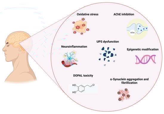 Parkinson’s disease (PD) is a prevalent neurological disease that results in considerable morbidity and deterioration in quality of life. The condition arises from the degeneration of dopaminergic neurons in the substantia nigra pars compacta, with oxidative stress being a significant element in the course of the illness [59]. The symptoms involve bradykinesia, rigidity of the muscles, resting tremor, and impairments in posture and walking. Non-motor characteristics encompass olfactory impairment, cognitive deficits, psychiatric manifestations, sleep disturbances, autonomic dysfunction, pain, and fatigue [60]. The complex nature of this pathology presents clinical obstacles, such as the inability to achieve a definitive diagnosis in the first stages and difficulties in symptom treatment during advanced stages [60]. Despite extensive study and development in molecular pathophysiology and pharmacology, no definitive therapy strategy exists for the management of PD [10].