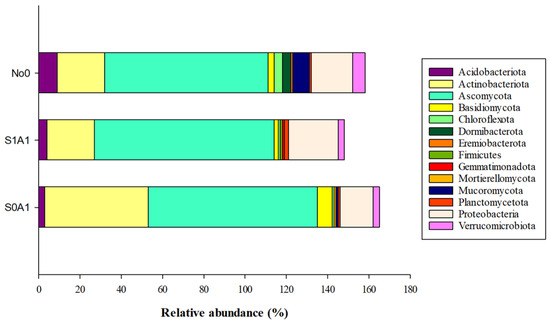 Relative abundance (%) of microbial phyla in typical areas of the Cerrado and sulfentrazone decontamination management using Avena sativa. S0A1—Avena sativa cultivation in an area with 0.0 g ha−1 of sulfentrazone; S1A1—A. sativa cultivation in an area with 600 g ha−1 of sulfentrazone; No0—Typical soil of the Cerrado biome.