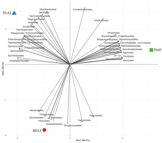 Cluster II, representing 41.7% of the orders, was mainly composed of Burkholderiales, Caulobacterales, Chaetosphaeriales, Deinococcales, Enterobacterales, Eurotiales, Filobasidiales, Gaiellales, Gemmatales, Gemmatimonadales, Helotiales, Limnocylindrales, Magnaporthales, Mycobacteriales, Pleosporales, Propionibacteriales, Sordariales, Sporidiobolales, Tepidisphaerales, and Tumebacillales, presenting a higher correlation and frequency in anthropized environments (S1A1) when compared to typical soil (No0) (Figure 2).