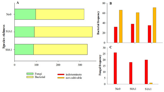 Frequency of cultivable, non-cultivable, and undetermined microbial species (richness) associated with the rhizosphere system of Avena sativa. (A) Species richness; (B) Bacterial frequency; (C) Fungal frequency. S0A1—Avena sativa cultivation in an area with 0.0 g ha−1 of sulfentrazone; S1A1—A. sativa cultivation in an area with a dose of 600 g ha−1 of sulfentrazone; No0—Typical soil of the Cerrado biome. Undetermined: species not yet identified at the species level by science; uncultivated: microorganisms previously identified in scientific studies but not yet characterized in the laboratory.