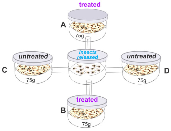The original populations of C. maculatus and C. chinensis, the main pests of cowpea bean (genus Vigna), were field-collected from small farms in the Viçosa region (Minas Gerais State, Brazil—20°45′20.23″ S, 42°51′50.95″ W) during the years 2018–2019. Both species were reared on their primary host, free from insecticide residues and other infestations. Cowpea (V. unguiculate) was obtained from the local market, and the grains were stored at −10 °C for two weeks before being provided to the weevils, ensuring the grains were free from other insect contamination. The adults were placed in ventilated glass jars (4 L) with the beans and maintained under laboratory conditions (27 ± 2 °C, 75 ± 5% relative humidity, 12 h of scotophase) [19].