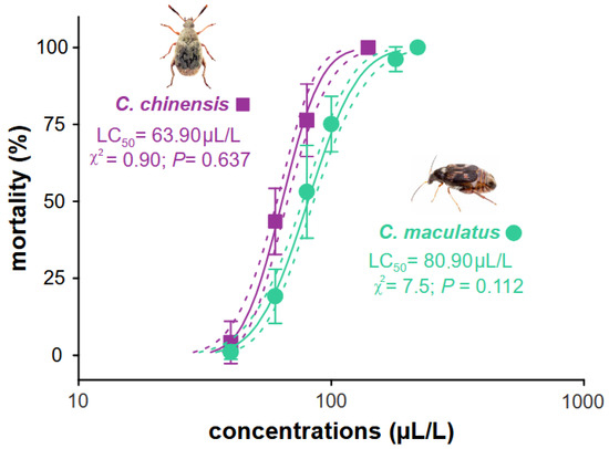 Concentration–mortality curve estimated for Bursera graveolens essential oil for Callosobruchus maculatus and C. chinensis. The full lines represent the estimated lethal concentration (LC) of each species, and the dotted lines represent the confidence intervals (95%). Symbols represent the average (±SE) mortality recorded for each essential oil concentration of four replicates.