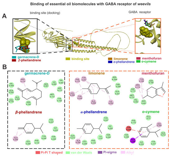 The limonene, o-cymene, α-phellandrene, β-phellandrene, germacrene D, and menthofuran bind with gamma-aminobutyric acid (GABA) sites of weevils (A); the molecular interactions of the same constituents with the amino acids from GABA active sites are also shown (B).