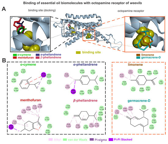 The limonene, o-cymene, α-phellandrene, β-phellandrene, germacrene D, and menthofuran bind with octopamine sites of weevils (A); the molecular interactions of the same constituents with the amino acids from octopamine active sites are also shown (B).