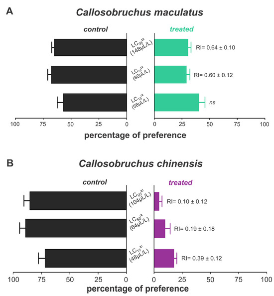 Repellency of Bursera graveolens essential oil to adult Callosobruchus maculatus (A) and Callosobruchus chinensis (B) in cowpea beans. Bars represent the average (±SE) percentage of insects found after 24 h of exposure.